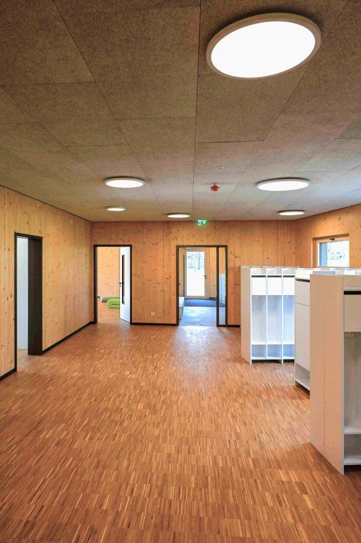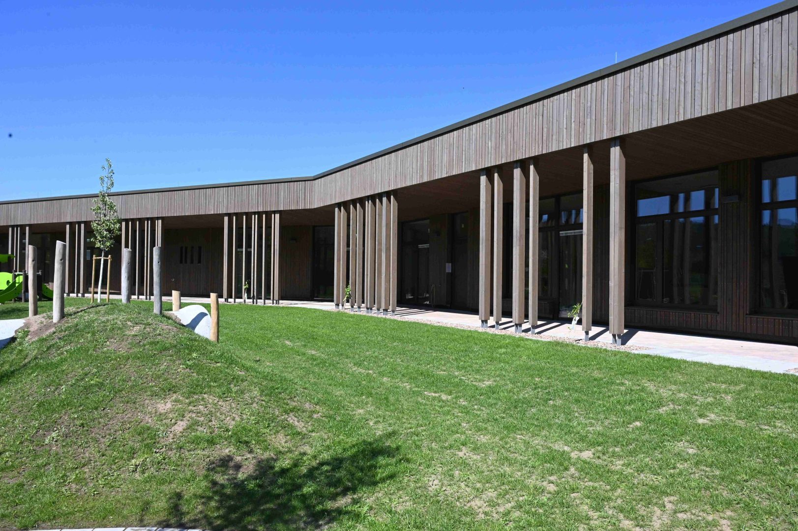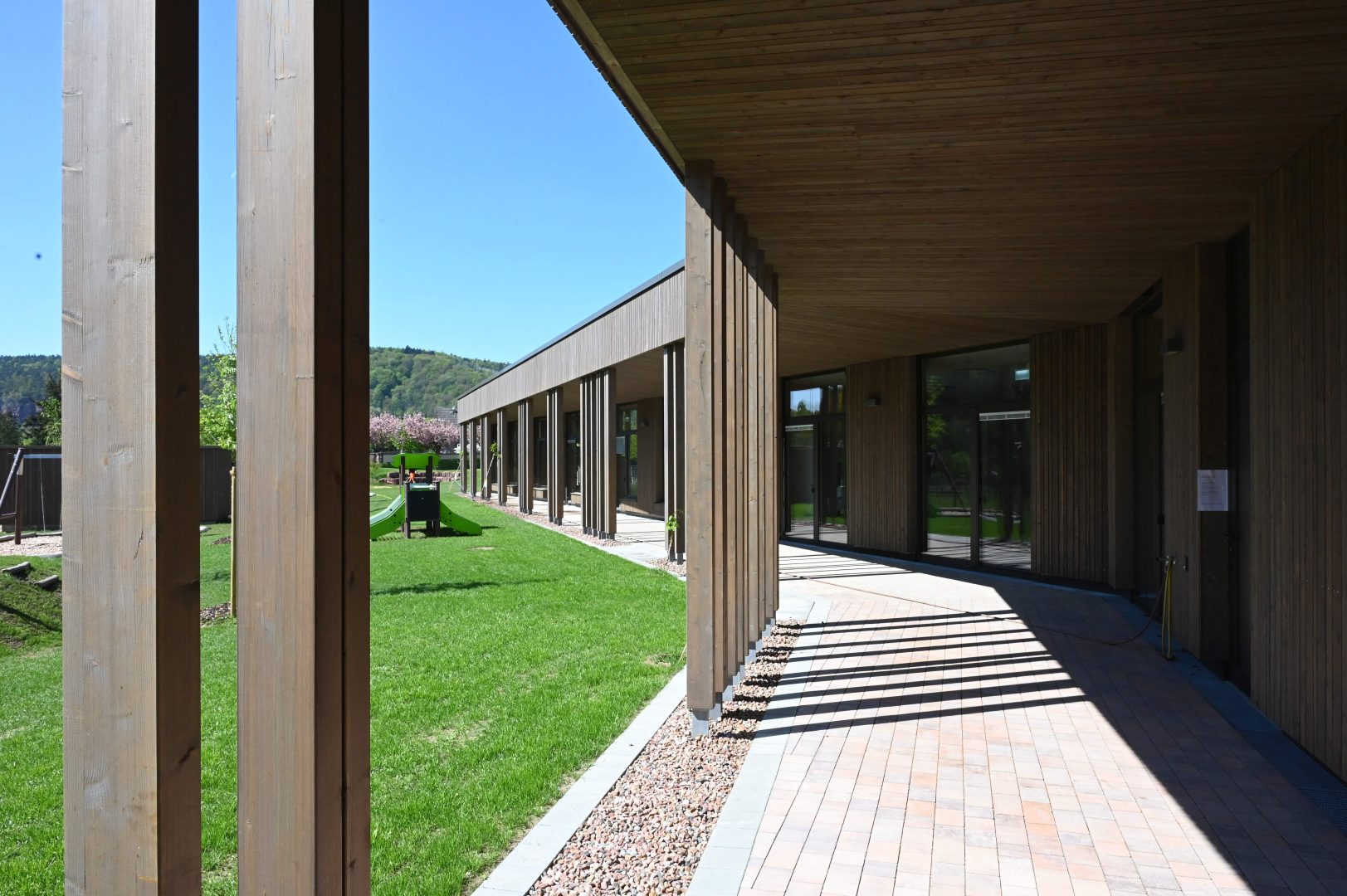 Die neue Kindertagesstätte folgt der Idee eines zentralen gemeinschaftlich genutzten Mehrzweckbereichs, der als Verbindungsglied zwischen den Jahrgangsstufen fungiert. Durch die Linearität des Baukörpers entsteht jederzeit eine Blickbeziehung und somit ein Übergang zwischen Innen und Außen, Mensch und Natur. Demnach ist das Gebäude aus der grundlegenden Struktur einer L-Form entstanden, der sich um den mittig angeordneten Erschließungskern asymmetrisch knickt und schließlich zwei Flügel aufspannt. So entstand die Gliederung in drei Bereich, die sich im Innenraum aneinanderreihen: Kindergarten – Verwaltung – Kinderkrippe. Die städtebauliche Form erinnert entfernt an einen Boomerang.